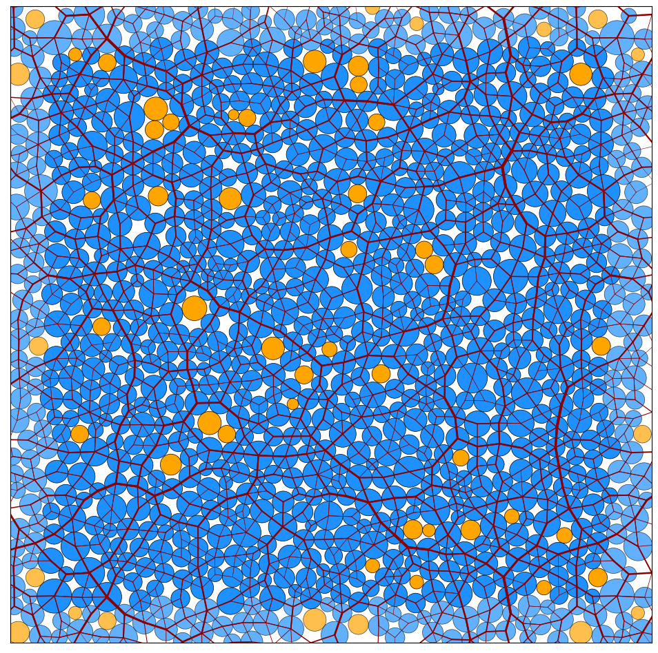 (Left: Monodisperse packing of 16k particles; coloured according to their number of contacts. Right: Polydisperse packing of 1024 disks, with radii from a log-normal distribution, and network of contacts drawn.