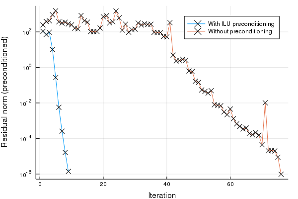 plot!(hist_without[:resnorm], label = "Without preconditioning", mark = :x)