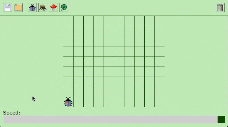 reset!(world): Resetsworldto the state after loading or the last call tostore!(world).store!(world): Stores the current state ofworld.place_kara(world,X,Y,orientation): Places Kara inworldatX,Yorientedorientation. Valid orientations are:NORTH,:EAST,:SOUTHand:WEST.orientationis optional and defaults to:NORTH.place_mushroom(world,X,Y): Places a mushroom inworldatX,Y.place_tree(world,X,Y): Places a tree inworldatX,Y.place_leaf(world,X,Y): Places a leaf inworldatX,Y.