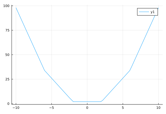 julia> pwl = Linearize(:(x^2),-10,10,Absolute(2))