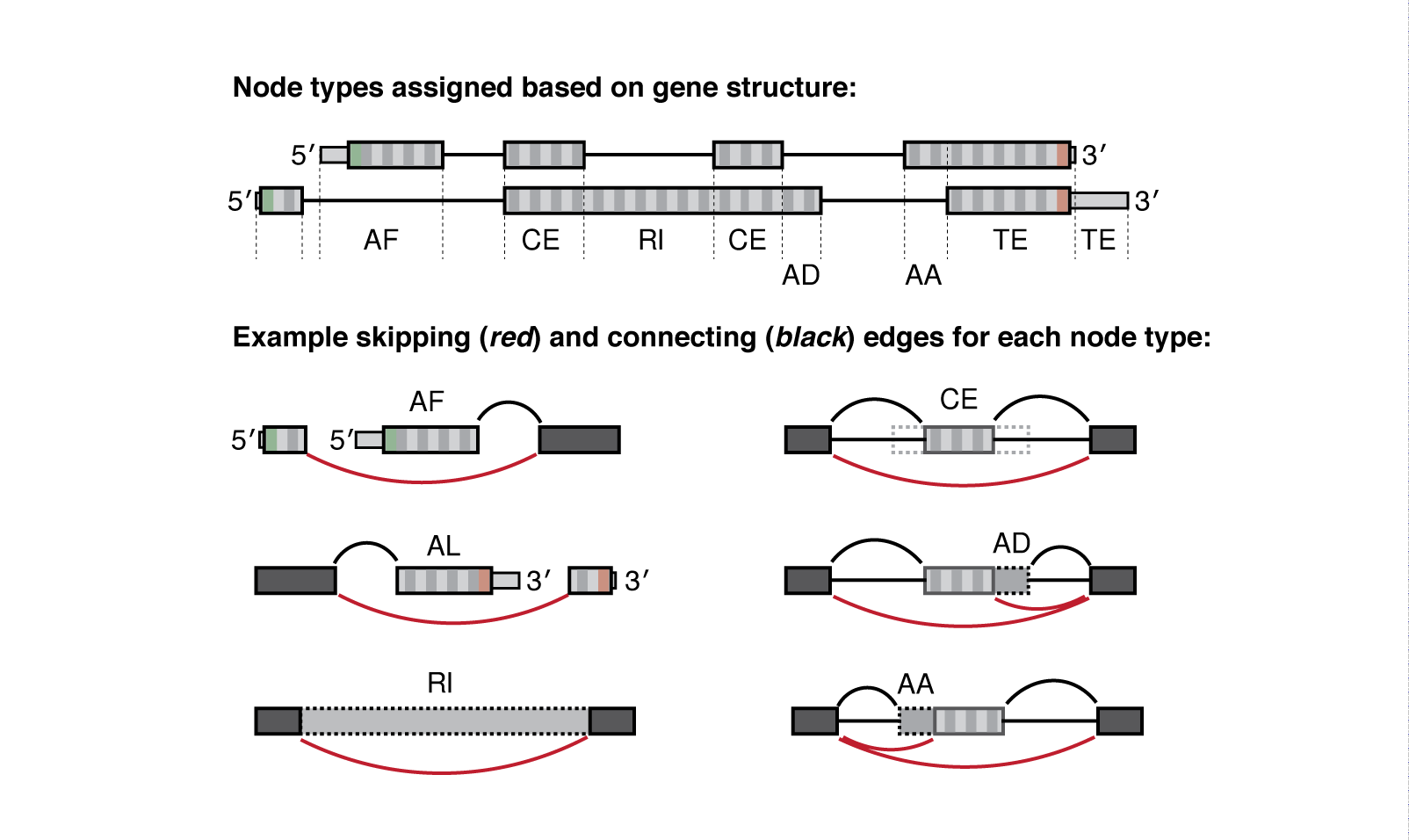 node. - Whippet can handle highly complex events, in contrast to many other splicing quantification tools which only report binary event types. Since, for example, it is possible for both (CE+AA) and CE exons to be excluded from the mature message, complex events may involve a number of overlapping full exons. If Whippet output was enumerated for all such combinations, the output for complex events would grow exponentially and approach uselessness.